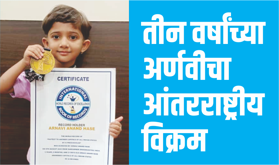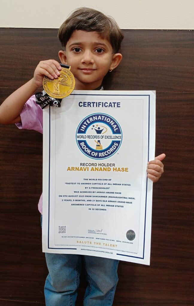 संगमनेर – वयाच्या केवळ 3 वर्षे 4 महिन्यांमध्येच अर्णवी आनंद हासे हिने अवघ्या 32 सेकंदांत भारतातील सर्व 28 राज्ये व त्यांची राजधानी अचूकपणे सांगून इंटरनॅशनल बुक ऑफ रेकॉर्ड्समध्ये आपले नाव नोंदवले आहे.