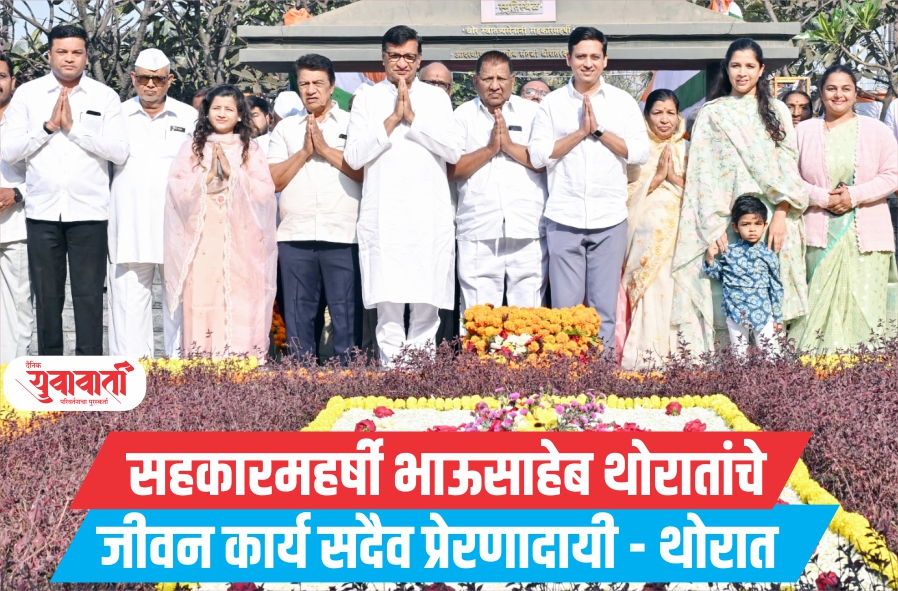 सहकारमहर्षी भाऊसाहेब थोरात सहकारी साखर कारखाना कार्यस्थळावर असलेल्या प्रेरणास्थळ येथे अभिवादन प्रसंगी कार्यक्रमाचे बोलत होते. यावेळी समवेत मा. आ. डॉ. सुधीर तांबे, सौ. दुर्गाताई तांबे, पांडुरंग पाटील घुले, लक्ष्मणराव कुटे, रणजीतसिंह देशमुख, संपतराव डोंगरे, सुधाकर जोशी, बाबा ओहोळ, नगराध्यक्षा डॉ. मैथिलीताई तांबे, डॉ. जयश्रीताई थोरात, सोलापूर येथील सतीशचंद्र देशमुख, महेश देशमुख, पंजाबच्या महिला सेवा दलाच्या प्रदेशाध्यक्ष ऋतुजा देशमुख, अजय फटांगरे, रामहरी कातोरे, रामदास पा.वाघ, प्राचार्य केशवराव जाधव, प्रा.बाबा खरात, हौशीराम सोनवणे, राजेंद्र गुंजाळ, के.के थोरात,राजेंद्र चकोर,कार्यकारी संचालक जगन्नाथ घुगरकर यांच्यासह अमृत उद्योग समूहातील सर्व संस्थांचे पदाधिकारी अधिकारी मोठ्या संख्येने उपस्थित होते. यावेळी बोलताना माजी मंत्री बाळासाहेब थोरात म्हणाले की, सहकारमहर्षी भाऊसाहेब थोरात यांनी आयुष्यभर आपल्या तत्त्वांची जपणूक केली. सामान्य माणसाच्या जीवनात आनंद निर्माण करण्याकरता सहकाराच्या माध्यमातून विविध संस्थांची उभारणी केली. सहकारी संस्थांमध्ये काटकसर, पारदर्शकता, शिस्त रुजवली. याचबरोबर राजकारण हे सत्तेसाठी नाही तर समाजाच्या विकासासाठी असते हा मंत्र सर्वांना दिला.