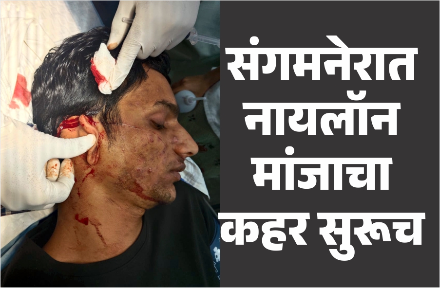 दरम्यान, संध्याकाळी सुमारे 6 वाजण्याच्या सुमारास नाईकवाडपुरा परिसरात आणखी एक धक्कादायक घटना घडली. हुजेब रौफ शेख (वय 23, रा. नाईकवाडपुरा, संगमनेर) हे आपल्या बहिणीला ट्युशनसाठी मोटारसायकलवरून घेऊन जात असताना अचानक नायलॉन मांजा त्यांच्या गळ्यात अडकला. त्यांनी क्षणार्धात मान फिरवल्यामुळे मांजाने त्यांच्या कानासह गळ्याला खोलवर चिरा दिल्या. या घटनेत हुजेब शेख गंभीर जखमी झाले असून त्यांना तातडीने उपचारासाठी रुग्णालयात दाखल करण्यात आले आहे.