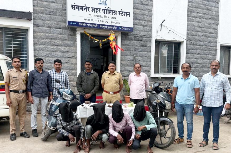 संगमनेर शहर पोलीस स्टेशनच्या पथकाने घुलेवाडी शिवारात मध्यरात्री टाकलेल्या छाप्यात दरोडा टाकण्याच्या तयारीत असलेल्या सराईत टोळीला साहित्यानिशी अटक केली. कारवाईदरम्यान एका आरोपीने अंधाराचा फायदा घेत पळ काढला. या टोळीवर संगमनेरासह जिल्ह्यात गंभीर स्वरूपाचे अनेक गुन्हे दाखल असून सुर्यवंशीची अर्धी टोळी पोलिसांच्या जाळ्यात अडकली आहे.