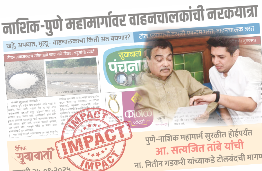 नाशिक-पुणे हायवेची ट्रॅफिक, रस्त्यांवरील खड्डे यावर सत्यजीत तांबे यांनी पुन्हा आवाज उठवला आहे. दैनिक युवावार्ताने 25-09-2025 च्या अंकामध्ये जोपर्यंत रस्त्याचे काम पूर्ण होत नाही तोपर्यंत टोल घेऊ नये अशी बातमी टाकली होती. तशीच मागणी आता आमदार सत्यजीत तांबे यांनी केंद्रीय रस्ते बांधणी विकास मंत्री ना. नितीन गडकरी यांच्याकडे केली आहे.